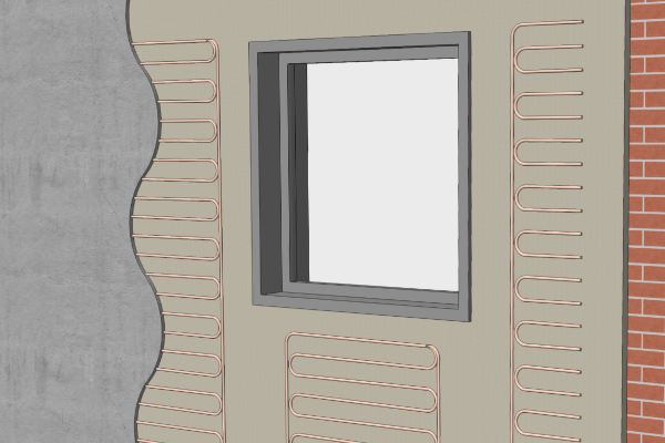 Um die Wärme effizient im Gebäude zu halten und Verluste zu minimieren, werden die Außenwände energetisch ertüchtigt. Ein hochdämmender Innenputz reduziert den Wärmeverlust, während eine integrierte Flächenheizung für eine gleichmäßige und behagliche Wärmeabgabe auf niedrigem Vorlauftemperaturniveau < 35 °C sorgt. Diese Anpassungen an den Wänden ermöglichen eine hohe Energieeffizienz, ohne das denkmalgeschützte Erscheinungsbild zu beeinträchtigen.